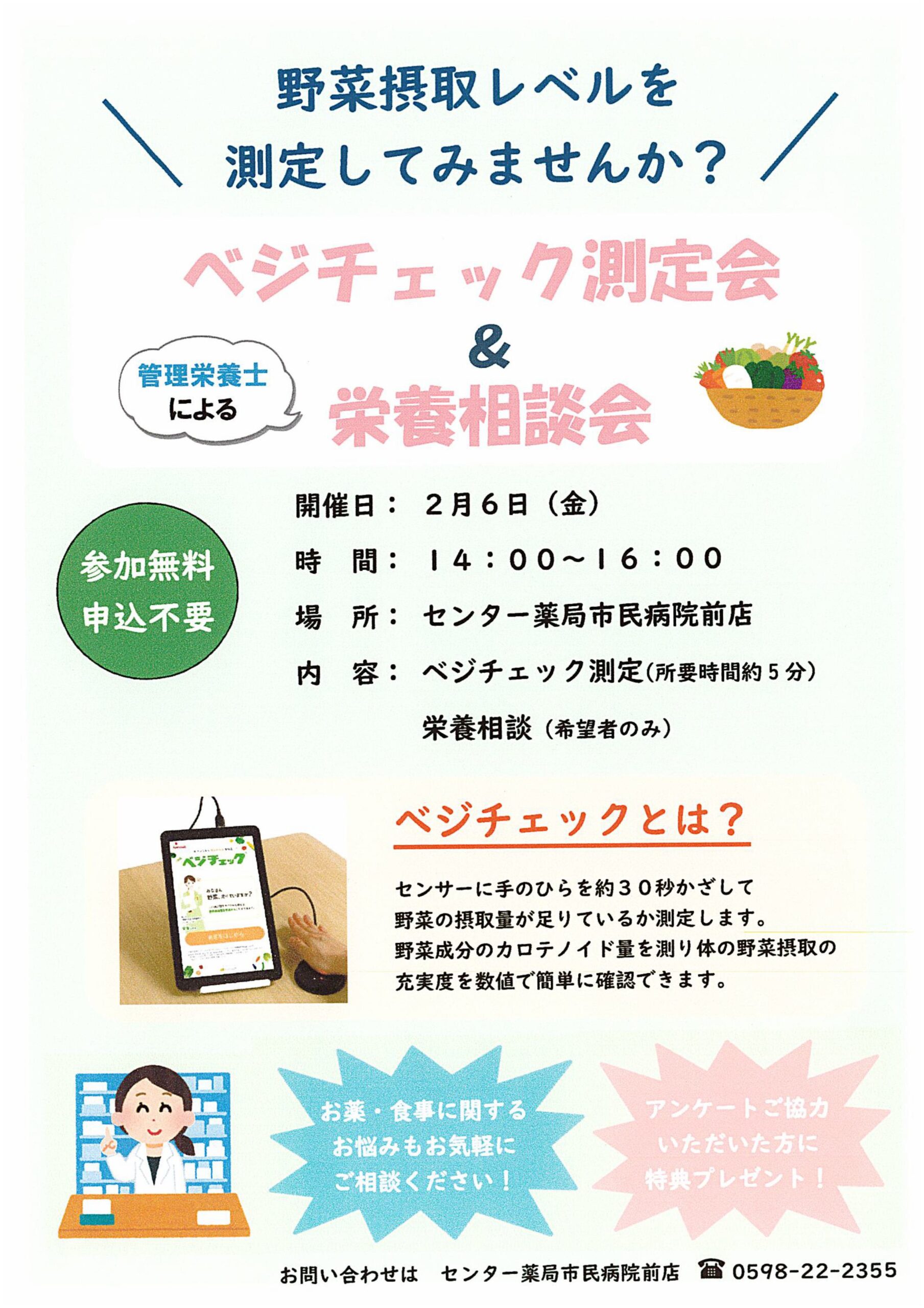 センター薬局市民病院前店では、ベジチェック測定会&栄養相談会を開催します。